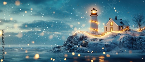 Serene Winter Landscape of a Snowy Lighthouse and Cozy House Adorned with Lights Amidst a Magical Snowfall and Tranquil Ocean in the Background at Dusk