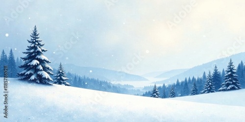 Serene Winter Landscape Snow-Covered Pines on a Gently Sloping Hill, Overlooking a Misty Valley with a Distant Line of Evergreen Trees Under a Softly Falling Snow