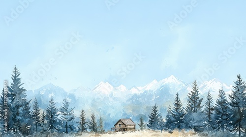 winter, landscape, cabin, tree, snow, mountain, blue skies, nature, tranquil, scenic, rural, outdoors, peaceful, fresh, scenic view, snowflake, sunlight, scenic beauty, isolation, vacation, escape, environment, exploration, filed, wilderness, driftwood, lifestyle, clear sky, cold weather, wild, rustic, home, nomadic, artistic, watercolor, quiet, solitude, get-away, winter landscape, frost, adventure, relaxation