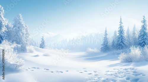 Serene Winter Landscape with Snow-Covered Trees and Footprints in Soft Light.