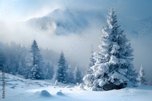Serene Winter Landscape with Snow-Covered Trees and Misty Mountains