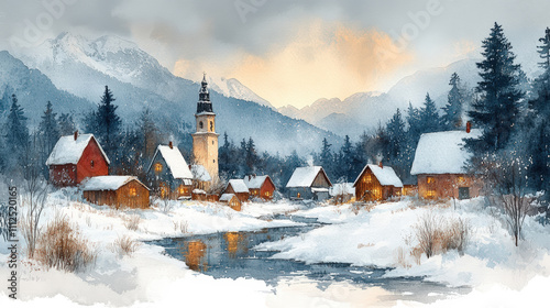 Serene Winter Landscape with Snowy Village, Mountains, River, and Soft Sunrise Glow Reflected on Calm Waters