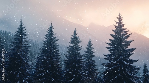 Serene Winter Mountain Landscape with Snow Falling on Pine Trees