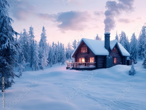 Serene Winter Scene of a Cozy Log Cabin Ablaze with Warm Light, Nestled Amidst Snowy Trees and a Tranquil Landscape at Dusk