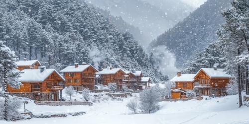 winter, snowfall, mountain, village, wooden, cabin, smoke, landscape, nature, serene, peaceful, cold, snowflake, tree, forest, rustic, weather, calmness, scenery, picturesque, scenic, quiet, beauty, earth, winter landscape, holiday, retreat, season, coldness, rural, frosty, fresh, bright, environment, fresh air, tour tourism, adventure, exploration, get-away, seasonal, natural, peacefulness, chilly, blue skies, cloud