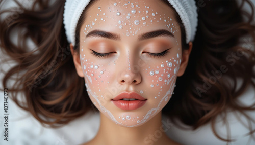 Serene woman adorned with a pearl-like face mask, experiencing a moment of blissful self-care, soft light enhancing her delicate features.