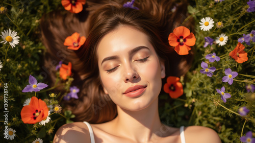 woman, flower, nature, beauty, relaxation, portrait, spring, outdoors, floral, peaceful, girl, sunlight, meadow, vibrant, happiness, joy, closeup, coiffure, skin, smile, feminine, colourful, daisy, poppy, violet, green, grass, serene, calmness, bliss, natural, summer, harmony, freshness, youth, charming, elegant, carefree, idylli, soft, delicate, facial, expression, landscape, garden
