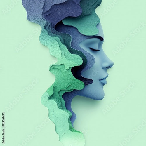 woman, face, profile, portrait, art, abstract, paper, cut, design, teal, green, blue, pastel, colours, texture, layer, contemporary, modern, illustration, graphic, background, aesthetic, minimal, style, serene, calm, peaceful, beauty, elegance, female, feminine, artistic