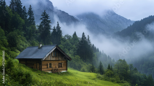 Serene Wooden Cabin Nestled in Lush Green Valley Surrounded by Majestic Mountains and Misty Fog, Evoking Tranquility and Nature's Beauty in a Scenic Landscape