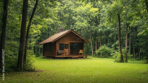 Serene wooden cabin nestled in the heart of a peaceful forest, ideal for a tranquil and rustic retreat.