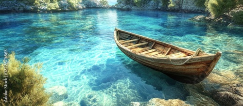 Serene wooden fishing boat anchored in tranquil azure lagoon illuminated by sunlight surrounded by lush greenery and clear tranquil waters.