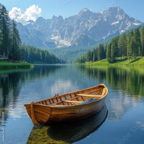Serene wooden rowboat floats on calm lake mirroring majestic mountains and lush forest.