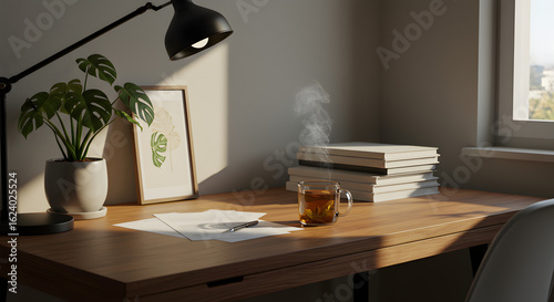 Serene workspace bathed in gentle sunlight, featuring tea, books, and a plant for a calming