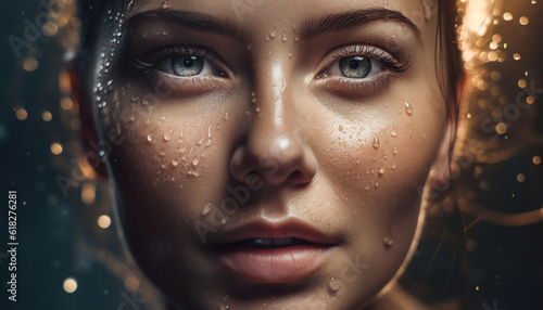 Serene young woman smiles in wet reflection generated by AI