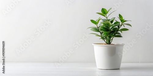 Serenely simplistic composition featuring a lush green potted plant with delicate leaves and stems resting elegantly in a pristine white pot on a white backdrop.