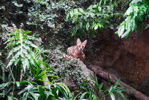 Serengeti Serval Cat in Lush Jungle Habitat: Wild feline amidst vibrant greenery, a captivating moment of nature's beauty