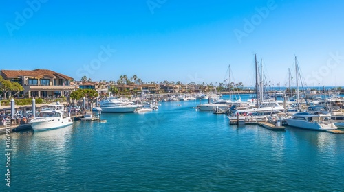 Serenity at the Marina: Vibrant Scene of Luxury Yachts, Sailboats, and Happy Seaside Visitors under the Clear Skies