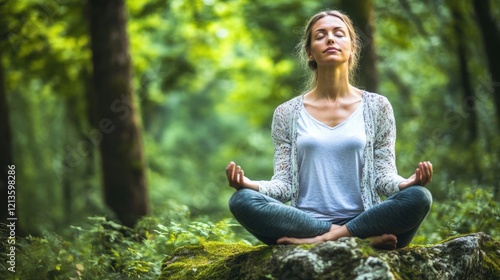 Serenity envelops a woman practicing meditation on a rock in a tranquil forest, connecting with nature and herself