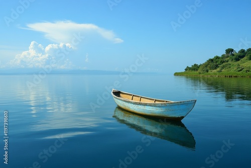 Serenity of a lone boat drifting on calm waters under a bright sky