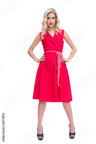 20s, young adult, woman, female, caucasian, white background, cut-out, isolated, attractive, beautiful, beauty, cute, elegance, model, honed, pretty, sensuality, long hair, fair hair, blond, light hair, curly hair, coiffure, blue eye, charming, gorgeous, seductive, body, dress, elegant, glamour, sensual, sexy, shape, slim, red, thin, slender, posing, evening dress, smiling, smile, attitude, confidence, confident, portrait, serious