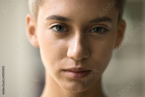 Serious beautiful face of young teenage girl with short haircut, clean smooth skin looking at camera. Pretty teenager, beauty care model cropped close up shot, facial portrait
