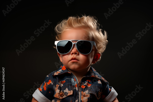 Serious blonde baby wearing sunglasses, dressing fashionably with a casual attitude and a fashionable hairstyle