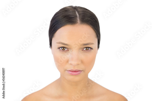 20s, young adult, woman, female, white background, isolated, cut-out, attractive, beautiful, beauty, care, clean, cute, fresh, freshness, charming, model, gorgeous, natural, honed, pretty, purity, shoulder, skin, skincare, wellness, posing, brown hair, brunette, portrait, serious, stern, unsmiling, frowning, naked, naked, bare
