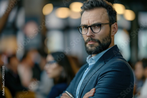 Serious Business: Attentive Businessman Listening to Colleagues in Professional Attire