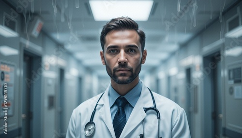 doctor, hospital, serious, medicals, professional, health care, hallway, portrait, health, clinic, medicine, physician, stethoscope, man, male, uniform, patient, care, treatment, recovery, wellness, disease, emergency, ward, building, corridor, indoor, white, coat, trust, hope, calm, seriousness, intense, gaze, sharpened, determination, expertise, confident, competent, professionalism