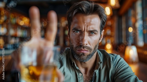 Serious middle-aged man with scruffy beard, green shirt, making peace sign at bar with beer glass in front. Background shows bar setting.