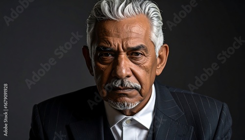 man, older, serious, business, suit, dark, background, portrait, closeup, grey, hair, facial, expression, sharpened, sharp, formal, concentrated, intense, confident, stern, aged, mature, indian, middle, eastern, hispanic, latino, pinstripe, white, shirt, eye, mouth, beard, moustache, face, studio, light, composition, photo, image, subject