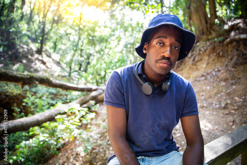 hiking, tenerife, male, portrait, hipster, green, relax, tree, earphones, polo, hat, day, posing, traveler, holiday maker, black man, african, nature, natural, trekking, eye, grass, plant, lifestyle, individuality, sitting, forest, free, stylish, serious, sunlight, journey, recreation, tree, active, adventure, wilderness, activity, race, travel, outdoors, summer, man