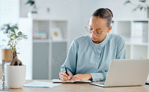 Serious, thinking and confident finance manager writing notes in notebook or book in office. Financial boss planning, arranging and scheduling deadlines for tax or calculating business profit or loss