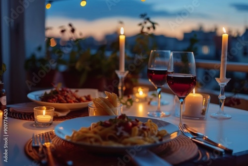 Served Dinner Table on Roof Terrace, Evening Food with Wine, Romantic Candles, Old Town View