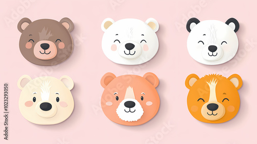 Set Bear card templates. Cute cartoon bear faces,paper art and digital craft style.