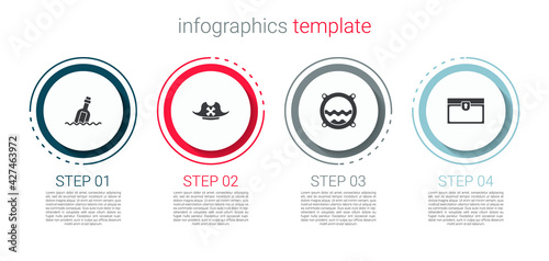 Set Bottle with message in water, Pirate hat, Ship porthole seascape and Antique treasure chest. Business infographic template. Vector