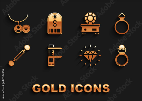 Set Calliper or caliper and scale, Diamond engagement ring, Piercing, Gem stone, Locket necklace and Price tag with dollar icon. Vector