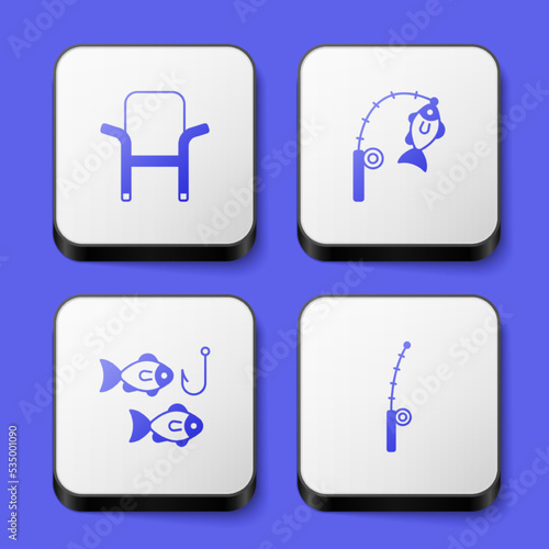 Set Camping folding chair, Fishing rod and fish, hook with and icon. White square button. Vector