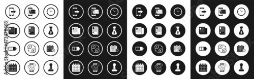 Set Clock, File document, Smartphone, mobile phone, Money bag, Mobile and credit card, Financial calendar and Battery charge level indicator icon. Vector