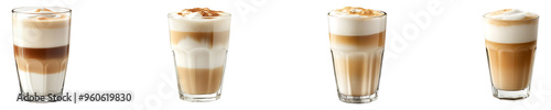 Set, collection of a glass of coffee with milk and foam isolated on transparent background.
