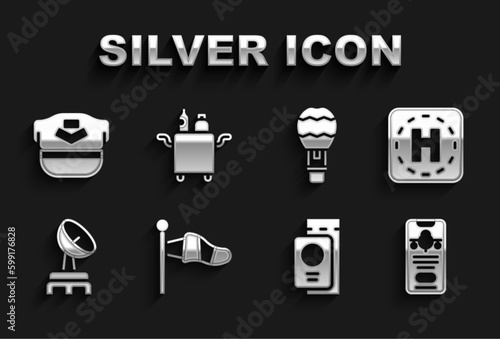 Set Cone meteorology windsock, Helicopter landing pad, Mobile with ticket, Passport, Radar, Hot air balloon, Pilot hat and Trolley for food icon. Vector