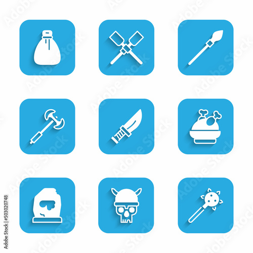 Set Dagger, Skull with viking helmet, Mace spikes, Roasted turkey or chicken, Magic rune, Medieval poleaxe, spear and Old money bag icon. Vector