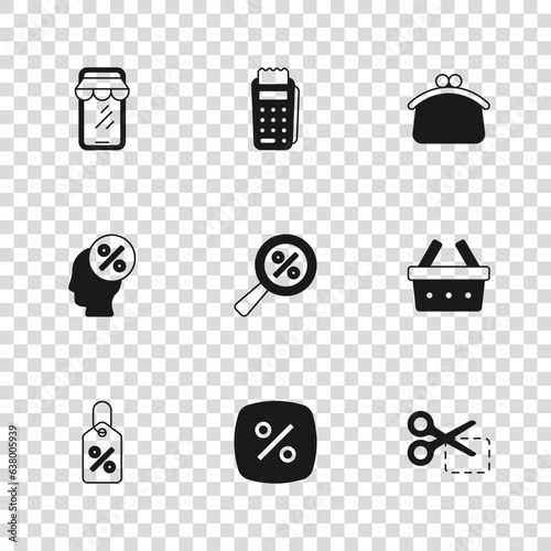 Set Discount percent tag, Shopping basket, Scissors cuts discount coupon, Magnifying glass with, Wallet, Online shopping phone, POS terminal and icon. Vector