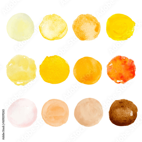 Set gold paint brush round strokes, hand drawn. collection vector abstract yellow orange circle and blots on white isolated background.