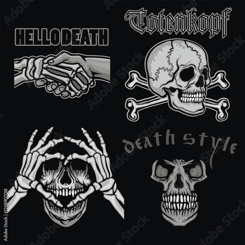 skull, skeleton, bone, halloween, death, gothic, cross, pirate, zombie, killer, tattoo, dead, devil, satan, pentacle, daemon, day of the dead, black, wing, crown, goat, vintage, emblem, blazonry, vector, print, design, pattern, symbol, fashion, textile, clothes, logotype, sticker, icon, label, badge, danger, signs, grunge