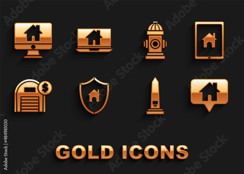 Set House with shield, Tablet and smart home, Map pointer house, Washington monument, Warehouse dollar symbol, Fire hydrant, Computer monitor and Laptop icon. Vector