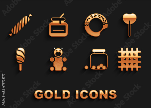 Set Jelly bear candy, Lollipop, Cracker biscuit, Glass jar with candies inside, Ice cream, Donut, Candy and Jar of honey icon. Vector
