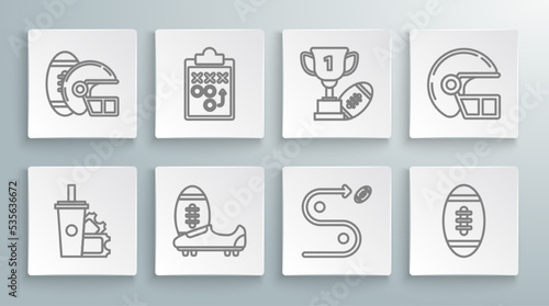 Set line American Football ticket and paper glass soda with drinking straw, Planning strategy concept, Soccer or football shoes spikes, Award cup, helmet and icon. Vector