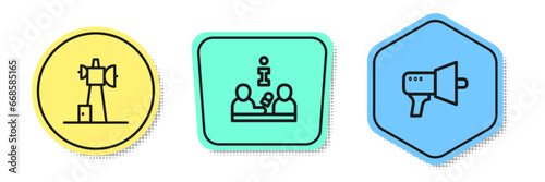 Set line Antenna, Interview and Megaphone. Colored shapes. Vector