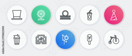 Set line Balloons with ribbon, Party hat, Popcorn in cardboard box, Ice cream, Paper glass water, Roller coaster, Vintage bicycle and Casino win icon. Vector
